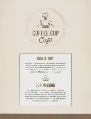 At Coffee Cup Cafe, we are passionate about creating delicious foods using only the freshest ingredients. Our recipes have been handed down for years, since 1970 in fact! We are known for the best hot beef, and pies around. Stop by and see for yourself!